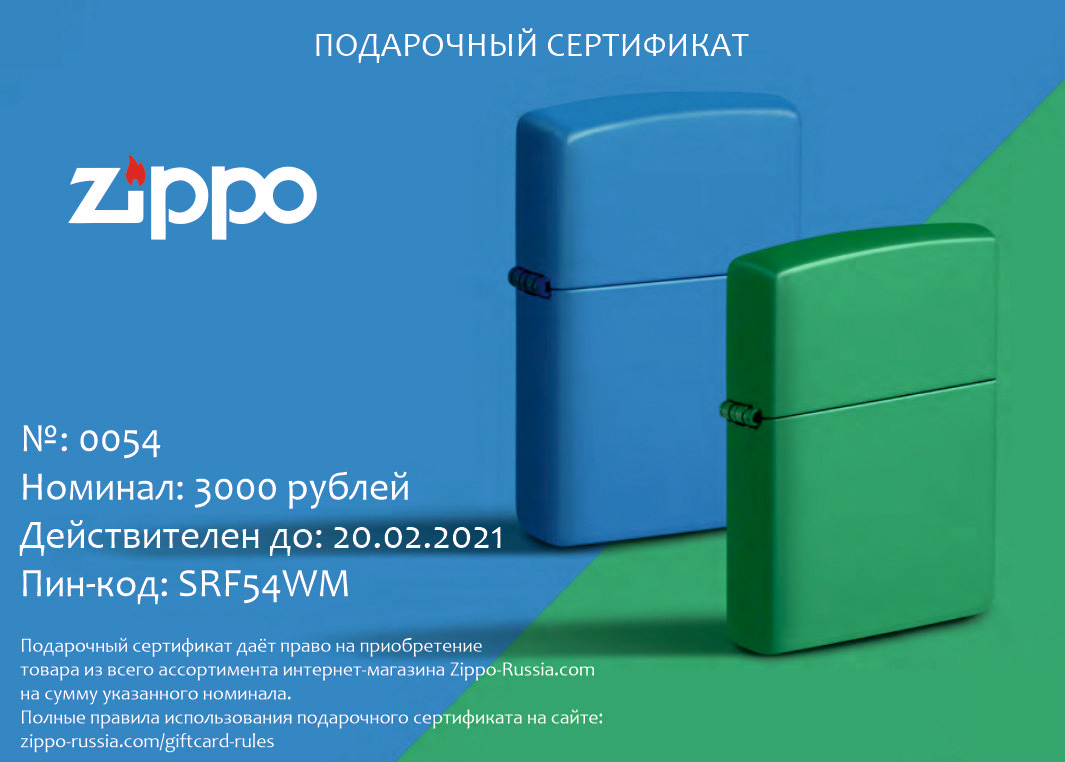 Подарочный сертификат Zippo 10000 от официального дилера Zippo в Жуковске. Вы можете дополнительно заказать гравировку, которая подчеркнет Вашу оригинальность и придаст памятность статусному подарку.